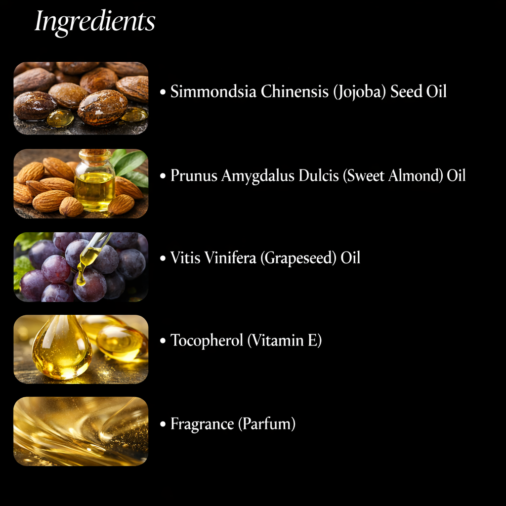 Simmondsia Chinensis (Jojoba) Seed Oil, Prunus Amygdalus Dulcis (Sweet Almond) Oil, Vitis Vinifera (Grapeseed) Oil, Tocopherol (Vitamin E), Fragrance (Parfum)
